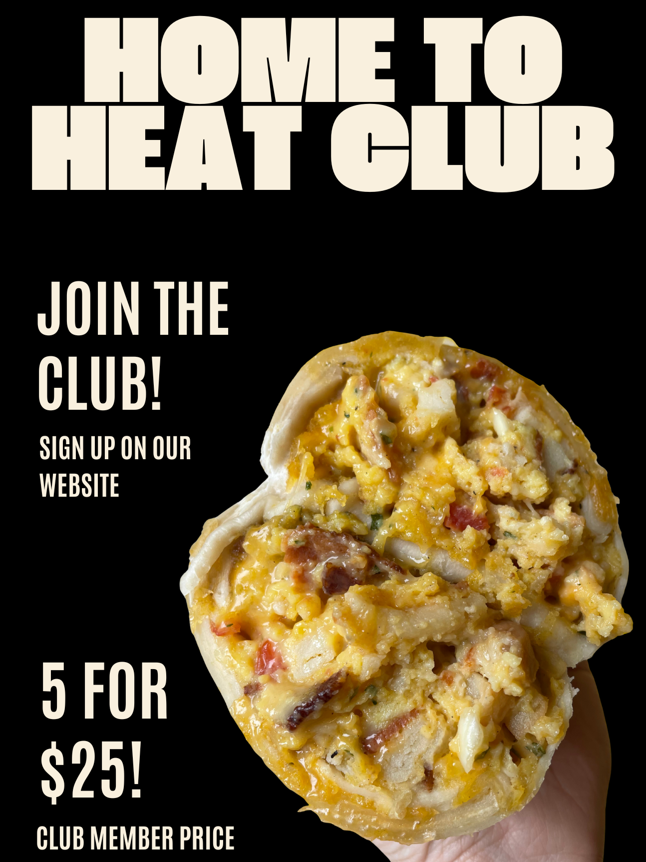 Fill your fridge or freezer with our burritos! Join the club and enjoy 5 burritos for $25. Our special member price! All you gotta do is sign up for our newsletter list and you’re in the club.