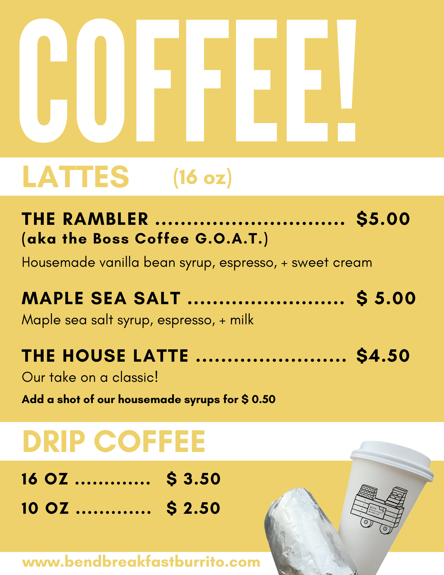Cater breakfast from us for your team meeting or event! Breakfast burritos, banana bread muffins, coffee, and more straight to your office, home, or event space. Delivery is FREE for orders over $50 delivered within Bend. Need an order delivered outside of Bend? Just contact us!
