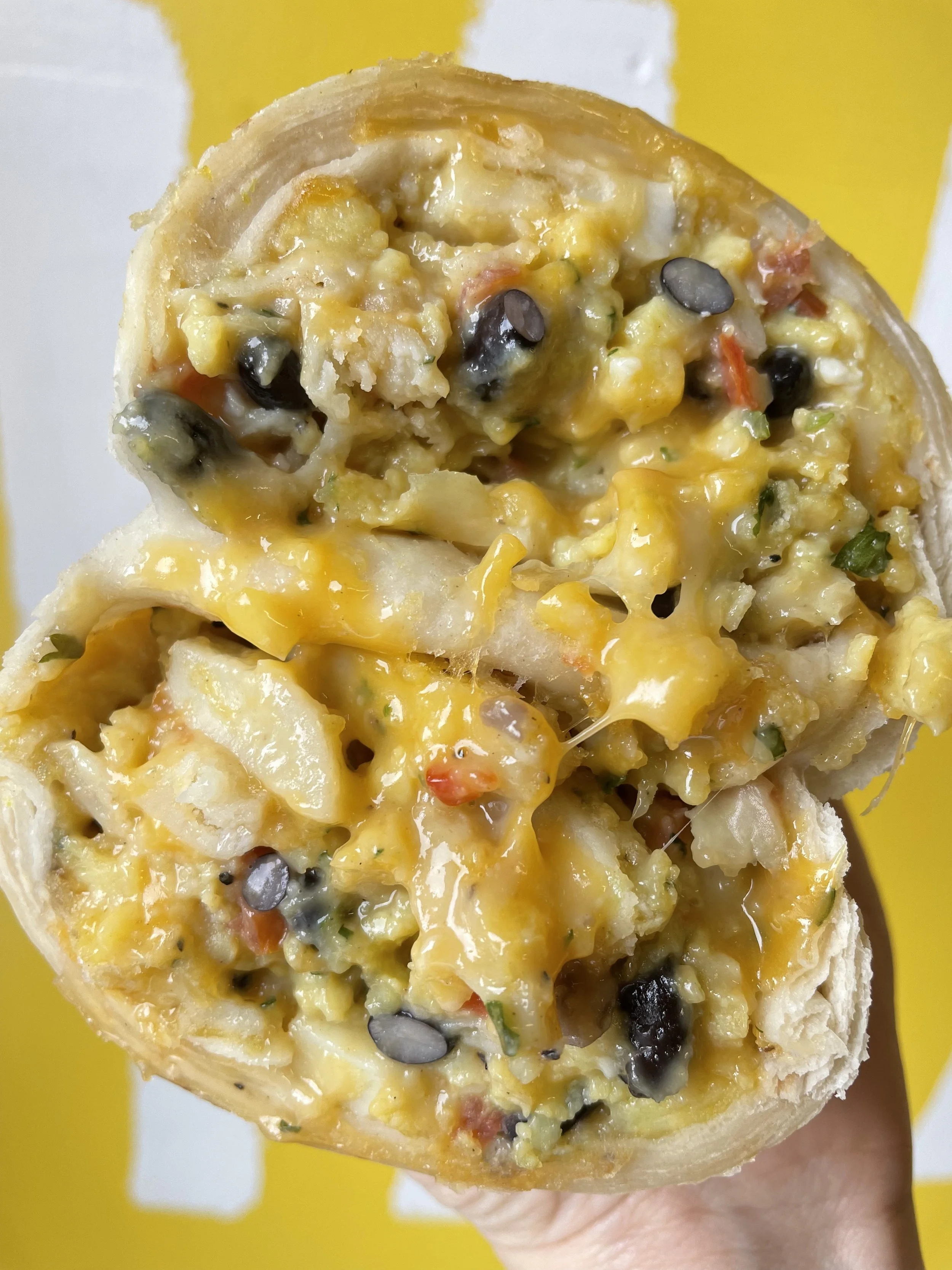 Scrambled Eggs, Black Beans, Seasoned Potatoes, Jack and Cheddar Cheese, Tomato, Onion and Cilantro.
