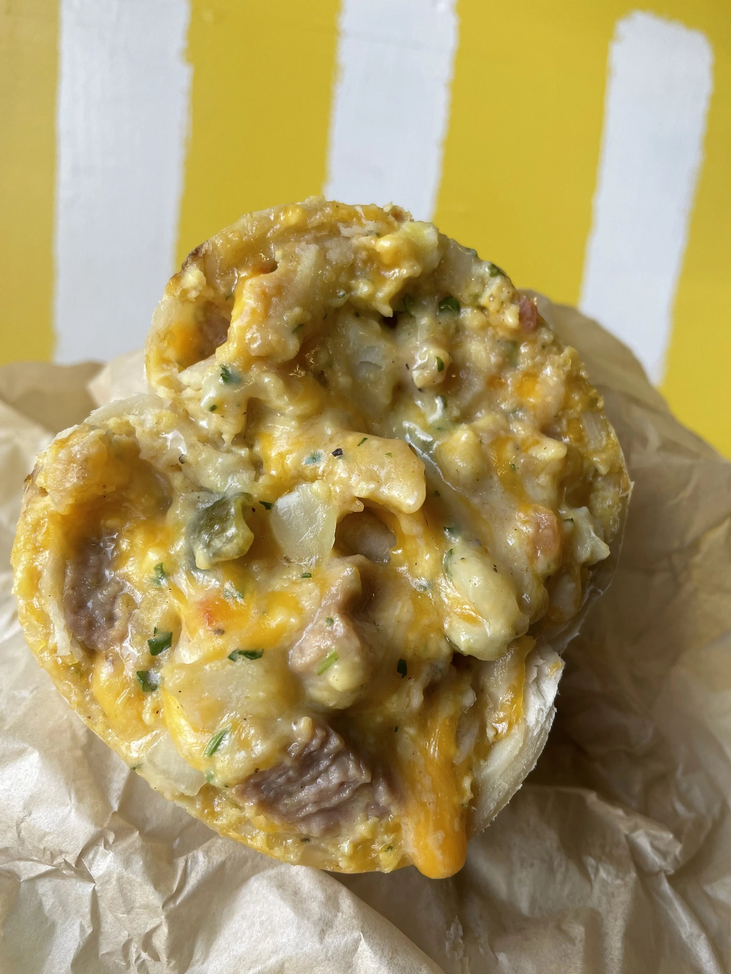 24-hour slow cooked Tri Tip, Roasted Anaheim Chilies, Scrambled Eggs, Seasoned Potatoes, Jack & Cheddar Cheese, Tomato, Onion, and Cilantro
