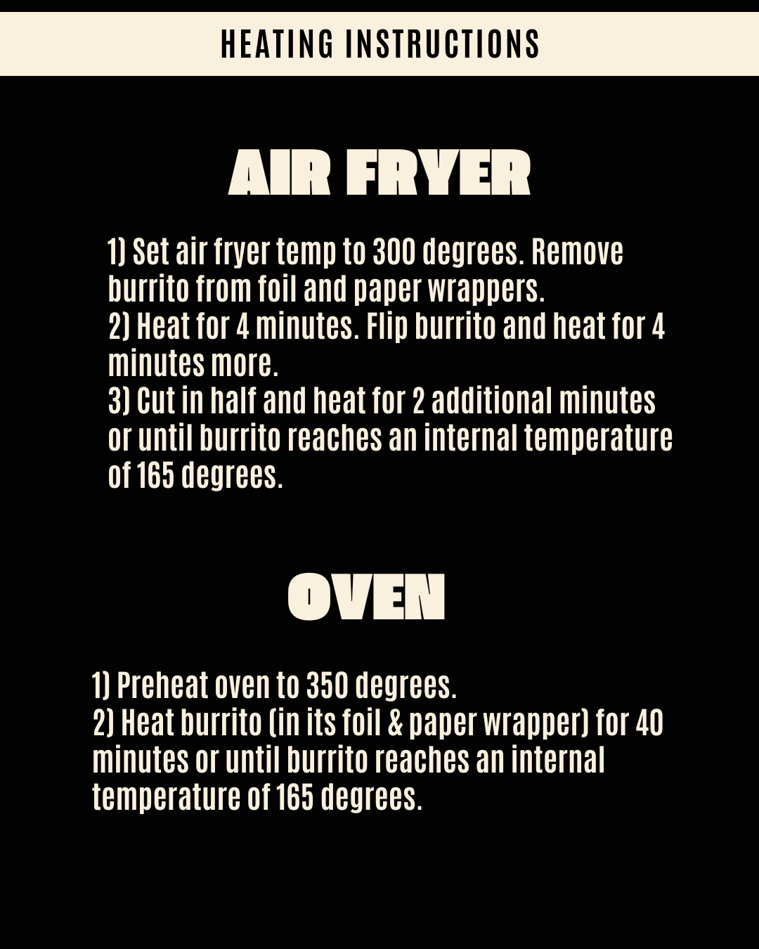 2) Heat burrito (in its foil & paper wrapper) for 40 minutes or until burrito reaches an internal temperature of 165 degrees.